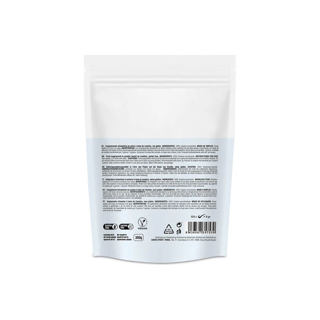 Producto sin gluten y vegano, únicamente creatina monohidrato, sin conservantes, estabilizantes o maltodextrinas añadidas